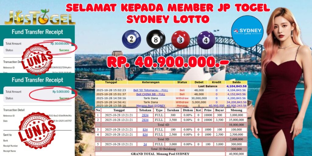 Selamat kepada User ID : BRI***99 Telah berhasil mendapatkan kemenangan besar pada Permainan JP TOGEL SYDNEY LOTTO Dengan kemenangan Sebesar Rp 40.900.000,- Setelah mengisi formulir withdraw dengan kurung waktu hanya 5-10 menit pihak JUSTOGEL sudah melakukan transfer kepada pemilik User ID dan dana sudah dapat di cairkan oleh pemenang. Bukti pembayaran yang kami berikan merupakan bukti pembayaran yang SAH / VALID yang langung di dapatkan melaui tanda transfer transaksi dari Bank yang di tuju.