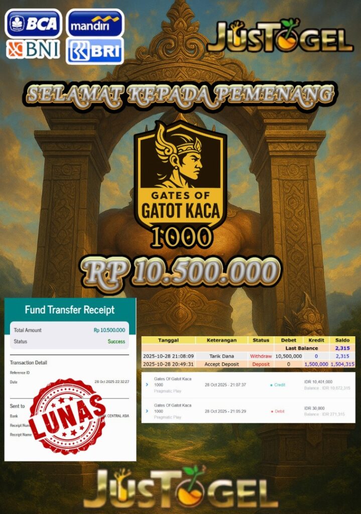 Selamat kepada User ID : MO***OY4 Telah berhasil mendapatkan kemenangan besar pada Permainan JP SLOT GATES OF GATOT KACA 1000 Dengan kemenangan Sebesar Rp 10.500.000,- Setelah mengisi formulir withdraw dengan kurung waktu hanya 5-10 menit pihak JUSTOGEL sudah melakukan transfer kepada pemilik User ID dan dana sudah dapat di cairkan oleh pemenang. Bukti pembayaran yang kami berikan merupakan bukti pembayaran yang SAH / VALID yang langung di dapatkan melaui tanda transfer transaksi dari Bank yang di tuju.