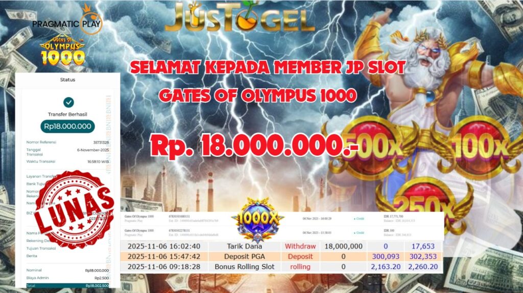Selamat kepada User ID : RAD***T09 Telah berhasil mendapatkan kemenangan besar pada Permainan JP SLOT GATES OF OLYMPUS1000 Dengan kemenangan Sebesar Rp 18.000.000,- Setelah mengisi formulir withdraw dengan kurung waktu hanya 5-10 menit pihak JUSTOGEL sudah melakukan transfer kepada pemilik User ID dan dana sudah dapat di cairkan oleh pemenang. Bukti pembayaran yang kami berikan merupakan bukti pembayaran yang SAH / VALID yang langung di dapatkan melaui tanda transfer transaksi dari Bank yang di tuju.