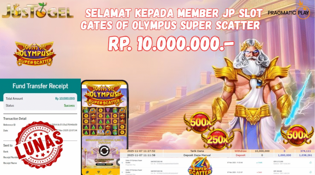 Selamat kepada User ID : NAR***88 Telah berhasil mendapatkan kemenangan besar pada Permainan JP SLOT GATES OF OLYMPUS SUPER SCATTER Dengan kemenangan Sebesar Rp 10.000.000,- Setelah mengisi formulir withdraw dengan kurung waktu hanya 5-10 menit pihak JUSTOGEL sudah melakukan transfer kepada pemilik User ID dan dana sudah dapat di cairkan oleh pemenang. Bukti pembayaran yang kami berikan merupakan bukti pembayaran yang SAH / VALID yang langung di dapatkan melaui tanda transfer transaksi dari Bank yang di tuju.