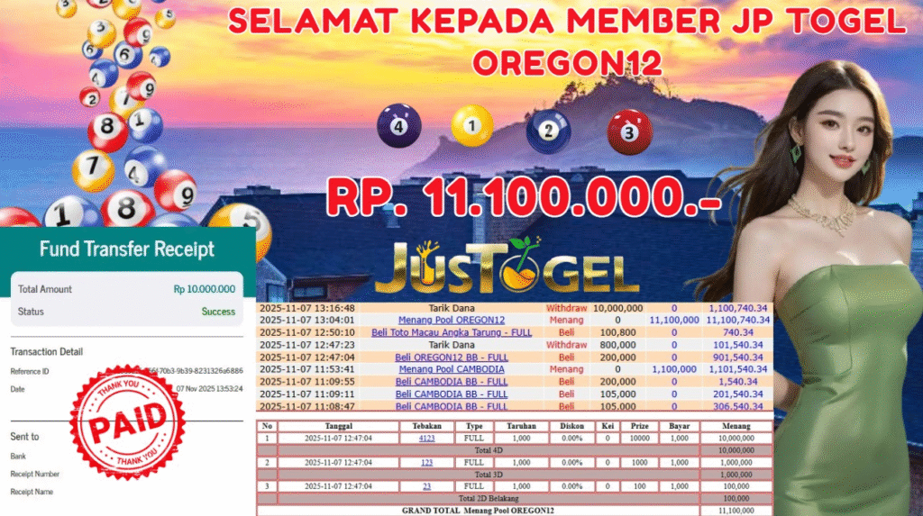 Selamat kepada User ID : KING***18 Telah berhasil mendapatkan kemenangan besar pada Permainan JP TOGEL OREGON12 Dengan kemenangan Sebesar Rp 11.100.000,- Setelah mengisi formulir withdraw dengan kurung waktu hanya 5-10 menit pihak JUSTOGEL sudah melakukan transfer kepada pemilik User ID dan dana sudah dapat di cairkan oleh pemenang. Bukti pembayaran yang kami berikan merupakan bukti pembayaran yang SAH / VALID yang langung di dapatkan melaui tanda transfer transaksi dari Bank yang di tuju.