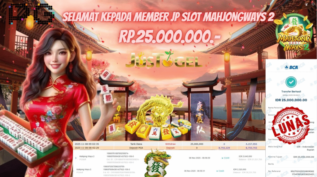 Selamat kepada User ID : KAR***SS Telah berhasil mendapatkan kemenangan besar pada Permainan JP SLOT MAHJONG WAYS 2 Dengan kemenangan Sebesar Rp 25.000.000,- Setelah mengisi formulir withdraw dengan kurung waktu hanya 5-10 menit pihak JUSTOGEL sudah melakukan transfer kepada pemilik User ID dan dana sudah dapat di cairkan oleh pemenang. Bukti pembayaran yang kami berikan merupakan bukti pembayaran yang SAH / VALID yang langung di dapatkan melaui tanda transfer transaksi dari Bank yang di tuju.