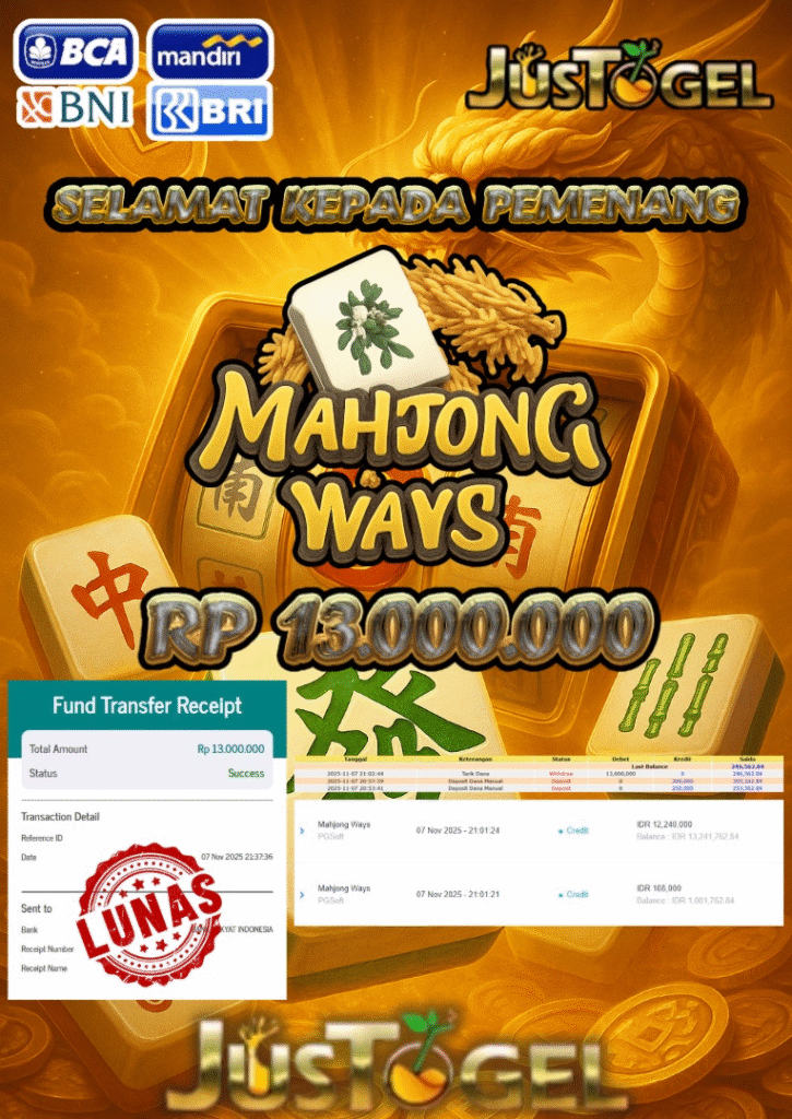 Selamat kepada User ID : RO**STA Telah berhasil mendapatkan kemenangan besar pada Permainan JP SLOT MAHJONG WAYS Dengan kemenangan Sebesar Rp 13.000.000,- Setelah mengisi formulir withdraw dengan kurung waktu hanya 5-10 menit pihak JUSTOGEL sudah melakukan transfer kepada pemilik User ID dan dana sudah dapat di cairkan oleh pemenang. Bukti pembayaran yang kami berikan merupakan bukti pembayaran yang SAH / VALID yang langung di dapatkan melaui tanda transfer transaksi dari Bank yang di tuju.
