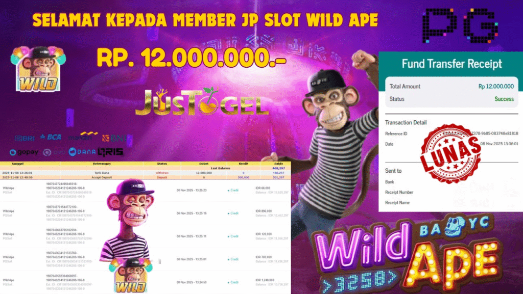 Selamat kepada User ID : BANG**88 Telah berhasil mendapatkan kemenangan besar pada Permainan JP SLOT WILD APE Dengan kemenangan Sebesar Rp 12.000.000,- Setelah mengisi formulir withdraw dengan kurung waktu hanya 5-10 menit pihak JUSTOGEL sudah melakukan transfer kepada pemilik User ID dan dana sudah dapat di cairkan oleh pemenang. Bukti pembayaran yang kami berikan merupakan bukti pembayaran yang SAH / VALID yang langung di dapatkan melaui tanda transfer transaksi dari Bank yang di tuju.