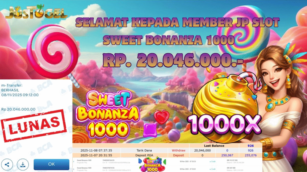 Selamat kepada User ID : HAM**A99 Telah berhasil mendapatkan kemenangan besar pada Permainan JP SLOT SWEET BONANZA 1000 Dengan kemenangan Sebesar Rp 20.046.000,- Setelah mengisi formulir withdraw dengan kurung waktu hanya 5-10 menit pihak JUSTOGEL sudah melakukan transfer kepada pemilik User ID dan dana sudah dapat di cairkan oleh pemenang. Bukti pembayaran yang kami berikan merupakan bukti pembayaran yang SAH / VALID yang langung di dapatkan melaui tanda transfer transaksi dari Bank yang di tuju.