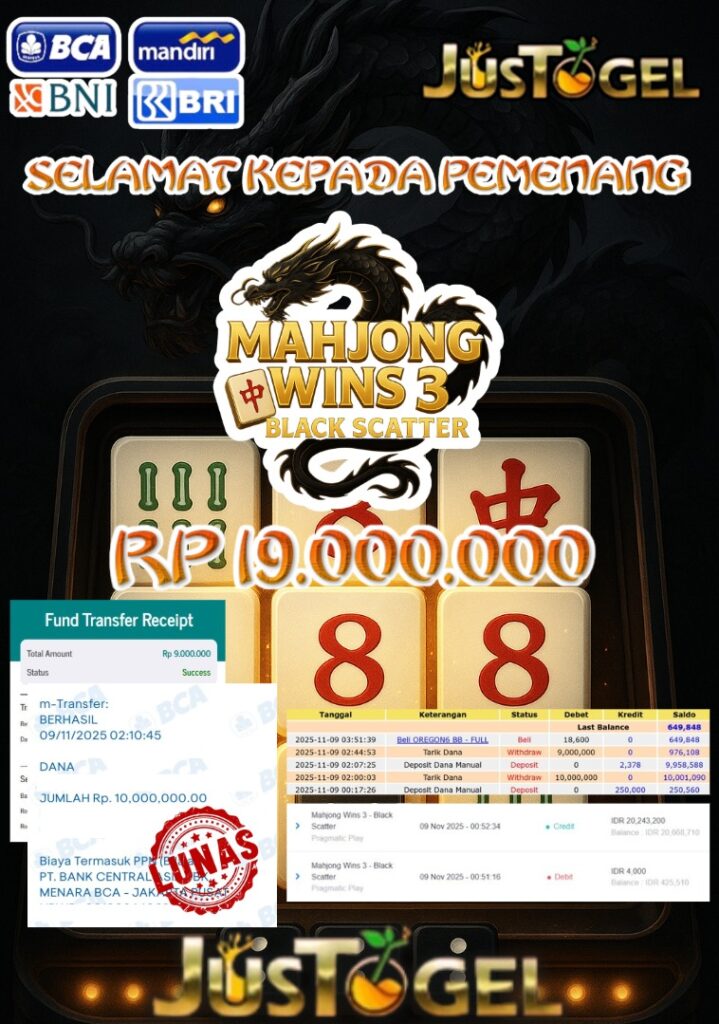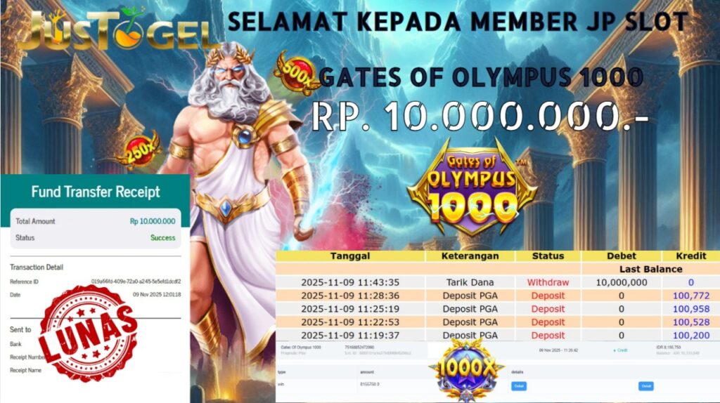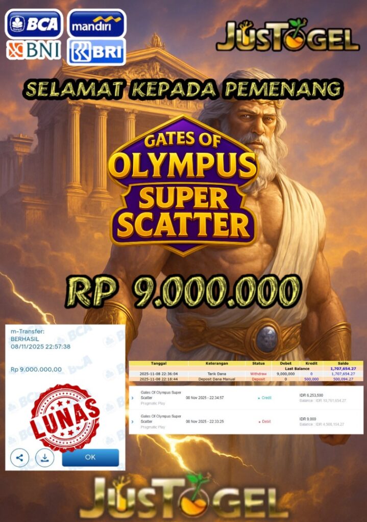 Selamat kepada User ID : KAR***22 Telah berhasil mendapatkan kemenangan besar pada Permainan JP LIVE GAME SWEET BONANZA CANDYLAND Dengan kemenangan Sebesar Rp 9.100.000,- Setelah mengisi formulir withdraw dengan kurung waktu hanya 5-10 menit pihak JUSTOGEL sudah melakukan transfer kepada pemilik User ID dan dana sudah dapat di cairkan oleh pemenang. Bukti pembayaran yang kami berikan merupakan bukti pembayaran yang SAH / VALID yang langung di dapatkan melaui tanda transfer transaksi dari Bank yang di tuju.