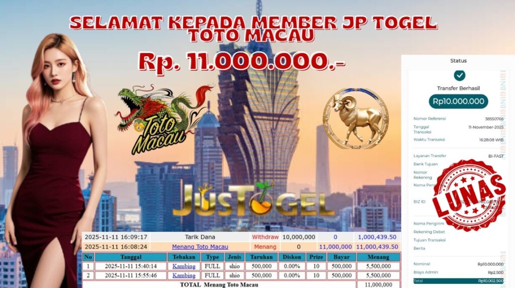Selamat kepada User ID : NAB**LA Telah berhasil mendapatkan kemenangan besar pada Permainan JP TOGEL TOTO MACAU Dengan kemenangan Sebesar Rp 11.000.000,- Setelah mengisi formulir withdraw dengan kurung waktu hanya 5-10 menit pihak JUSTOGEL sudah melakukan transfer kepada pemilik User ID dan dana sudah dapat di cairkan oleh pemenang. Bukti pembayaran yang kami berikan merupakan bukti pembayaran yang SAH / VALID yang langung di dapatkan melaui tanda transfer transaksi dari Bank yang di tuju.