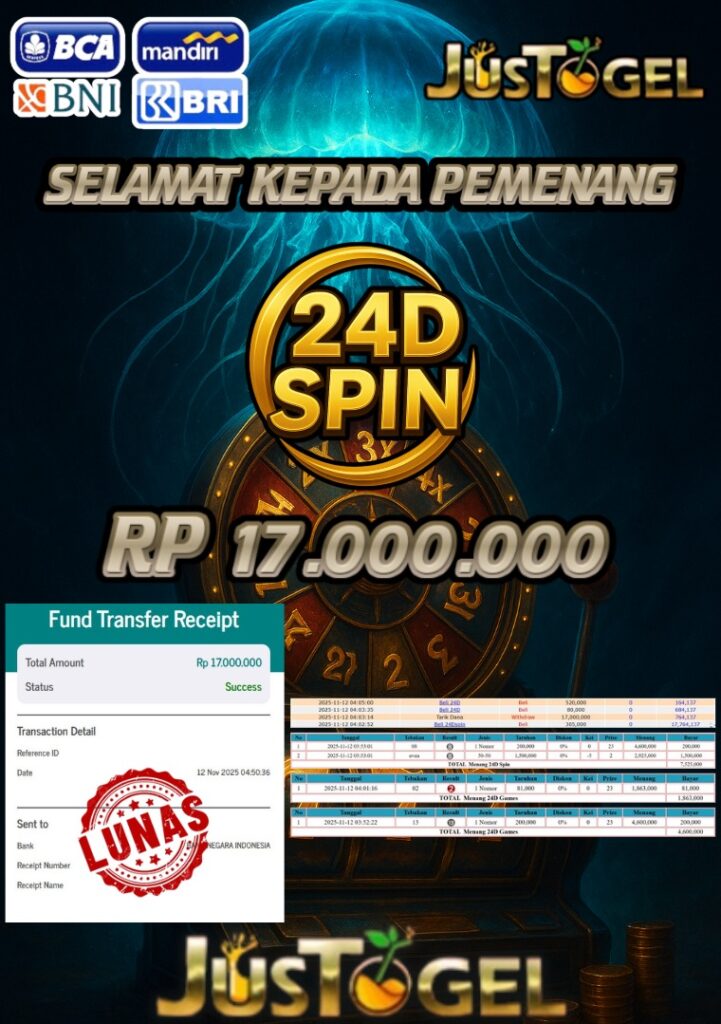 Selamat kepada User ID : YUS***AM Telah berhasil mendapatkan kemenangan besar pada Permainan JP LIVE GAME 24D SPIN Dengan kemenangan Sebesar Rp 17.000.000,- Setelah mengisi formulir withdraw dengan kurung waktu hanya 5-10 menit pihak JUSTOGEL sudah melakukan transfer kepada pemilik User ID dan dana sudah dapat di cairkan oleh pemenang. Bukti pembayaran yang kami berikan merupakan bukti pembayaran yang SAH / VALID yang langung di dapatkan melaui tanda transfer transaksi dari Bank yang di tuju.