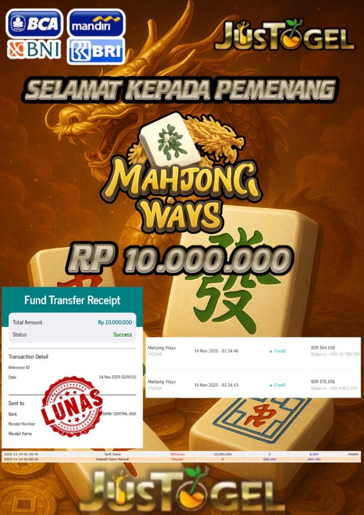 Selamat kepada User ID : MOR***SKIP Telah berhasil mendapatkan kemenangan besar pada Permainan JP SLOT MAHJONG WAYS Dengan kemenangan Sebesar Rp 10.000.000,- Setelah mengisi formulir withdraw dengan kurung waktu hanya 5-10 menit pihak JUSTOGEL sudah melakukan transfer kepada pemilik User ID dan dana sudah dapat di cairkan oleh pemenang. Bukti pembayaran yang kami berikan merupakan bukti pembayaran yang SAH / VALID yang langung di dapatkan melaui tanda transfer transaksi dari Bank yang di tuju.