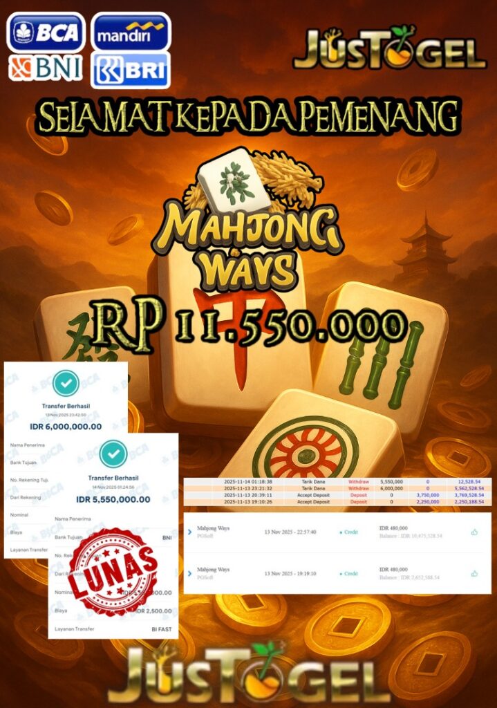 Selamat kepada User ID : JUS***HUB Telah berhasil mendapatkan kemenangan besar pada Permainan JP SLOT MAHJONG WAYS Dengan kemenangan Sebesar Rp 11.550.000,- Setelah mengisi formulir withdraw dengan kurung waktu hanya 5-10 menit pihak JUSTOGEL sudah melakukan transfer kepada pemilik User ID dan dana sudah dapat di cairkan oleh pemenang. Bukti pembayaran yang kami berikan merupakan bukti pembayaran yang SAH / VALID yang langung di dapatkan melaui tanda transfer transaksi dari Bank yang di tuju.