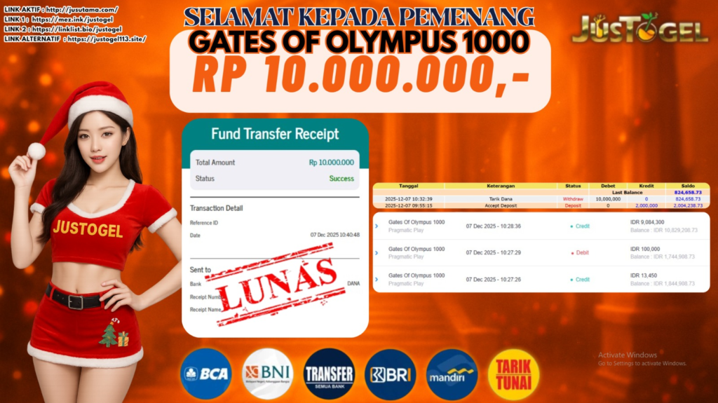 Selamat kepada User ID : RAM***IJO12 Telah berhasil mendapatkan kemenangan besar pada Permainan JP SLOT GATES OF OLYMPUS 1000 Dengan kemenangan Sebesar Rp 10.000.000,- Setelah mengisi formulir withdraw dengan kurung waktu hanya 5-10 menit pihak JUSTOGEL sudah melakukan transfer kepada pemilik User ID dan dana sudah dapat di cairkan oleh pemenang. Bukti pembayaran yang kami berikan merupakan bukti pembayaran yang SAH / VALID yang langung di dapatkan melaui tanda transfer transaksi dari Bank yang di tuju.