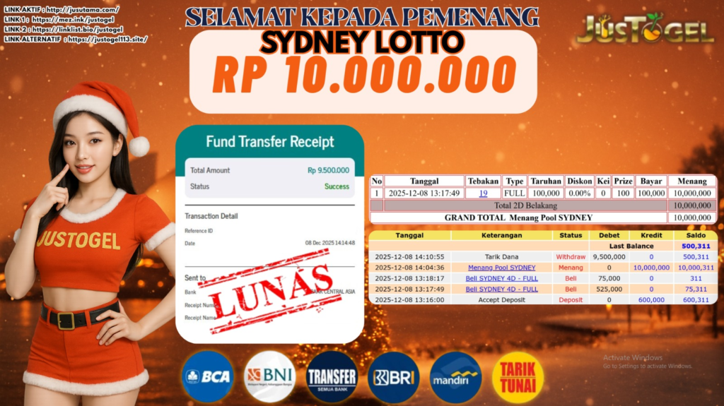 Selamat kepada User ID : MAL***SIUN77 Telah berhasil mendapatkan kemenangan besar pada Permainan JP TOGEL SYDNEY LOTTO Dengan kemenangan Sebesar Rp 10.000.000,- Setelah mengisi formulir withdraw dengan kurung waktu hanya 5-10 menit pihak JUSTOGEL sudah melakukan transfer kepada pemilik User ID dan dana sudah dapat di cairkan oleh pemenang. Bukti pembayaran yang kami berikan merupakan bukti pembayaran yang SAH / VALID yang langung di dapatkan melaui tanda transfer transaksi dari Bank yang di tuju.