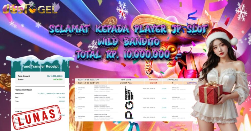 Selamat kepada User ID : AFR***L04 Telah berhasil mendapatkan kemenangan besar pada Permainan JP SLOT WILD BANDITO Dengan kemenangan Sebesar Rp 10.000.000 ,- Setelah mengisi formulir withdraw dengan kurung waktu hanya 5-10 menit pihak JUSTOGEL sudah melakukan transfer kepada pemilik User ID dan dana sudah dapat di cairkan oleh pemenang. Bukti pembayaran yang kami berikan merupakan bukti pembayaran yang SAH / VALID yang langung di dapatkan melaui tanda transfer transaksi dari Bank yang di tuju.