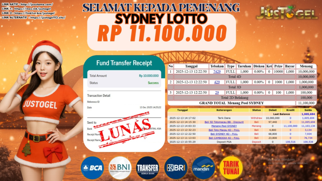Selamat kepada User ID : MAH***RU96 Telah berhasil mendapatkan kemenangan besar pada Permainan JP TOGEL SYDNEY LOTTO Dengan kemenangan Sebesar Rp 11.100.000,- Setelah mengisi formulir withdraw dengan kurung waktu hanya 5-10 menit pihak JUSTOGEL sudah melakukan transfer kepada pemilik User ID dan dana sudah dapat di cairkan oleh pemenang. Bukti pembayaran yang kami berikan merupakan bukti pembayaran yang SAH / VALID yang langung di dapatkan melaui tanda transfer transaksi dari Bank yang di tuju.