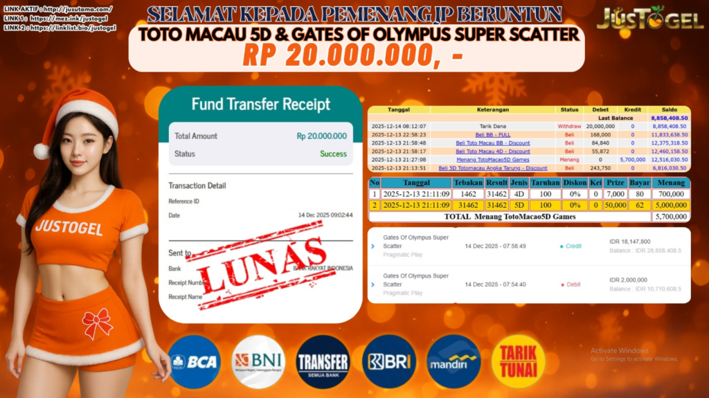 Selamat kepada User ID : NYIU***LAM22 Telah berhasil mendapatkan kemenangan besar pada Permainan JP TOGEL SYDNEY LOTTO Dengan kemenangan Sebesar Rp 12.300.000,- Setelah mengisi formulir withdraw dengan kurung waktu hanya 5-10 menit pihak JUSTOGEL sudah melakukan transfer kepada pemilik User ID dan dana sudah dapat di cairkan oleh pemenang. Bukti pembayaran yang kami berikan merupakan bukti pembayaran yang SAH / VALID yang langung di dapatkan melaui tanda transfer transaksi dari Bank yang di tuju.