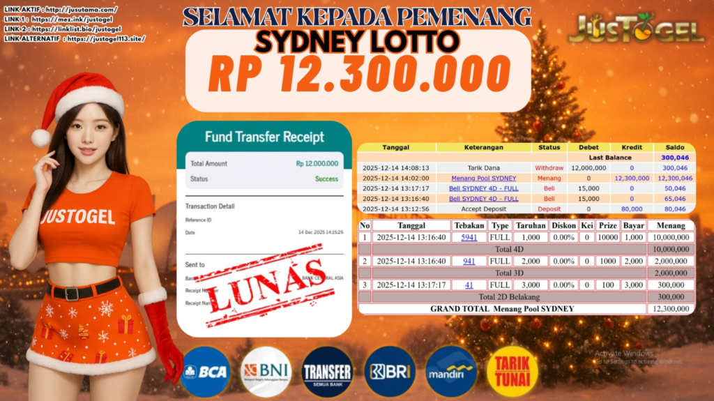 SELAMAT KEPADA MEMBER JP TOGEL SYDNEY LOTTO TOTAL Rp. 12.300.000.- LUNAS