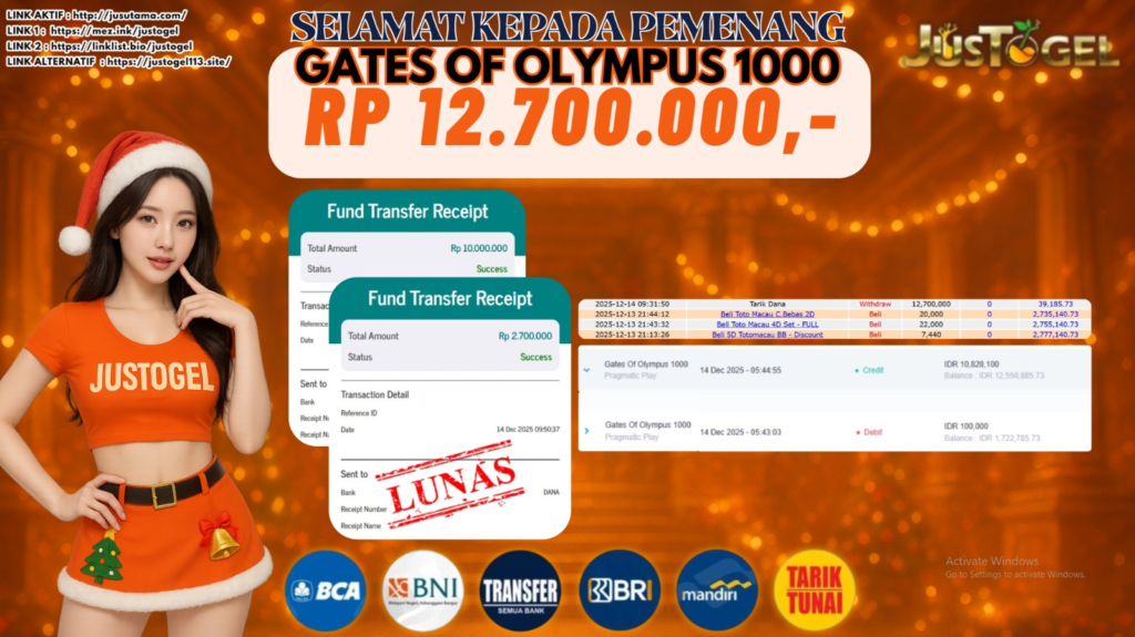 Selamat kepada User ID : MAH***NI12 Telah berhasil mendapatkan kemenangan besar pada Permainan JP SLOT GATES OF OLYMPUS 1000 Dengan kemenangan Sebesar Rp 12.700.000,- Setelah mengisi formulir withdraw dengan kurung waktu hanya 5-10 menit pihak JUSTOGEL sudah melakukan transfer kepada pemilik User ID dan dana sudah dapat di cairkan oleh pemenang. Bukti pembayaran yang kami berikan merupakan bukti pembayaran yang SAH / VALID yang langung di dapatkan melaui tanda transfer transaksi dari Bank yang di tuju.