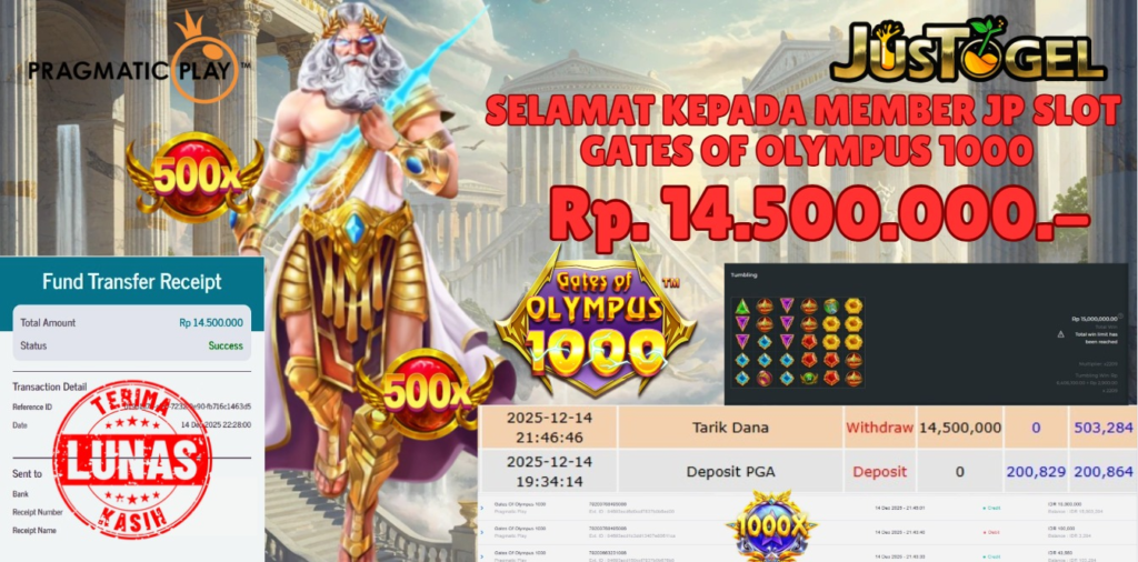Selamat kepada User ID : JAM***87 Telah berhasil mendapatkan kemenangan besar pada Permainan JP SLOT GATES OF OLYMPUS 1000 Dengan kemenangan Sebesar Rp 14.500.000,- Setelah mengisi formulir withdraw dengan kurung waktu hanya 5-10 menit pihak JUSTOGEL sudah melakukan transfer kepada pemilik User ID dan dana sudah dapat di cairkan oleh pemenang. Bukti pembayaran yang kami berikan merupakan bukti pembayaran yang SAH / VALID yang langung di dapatkan melaui tanda transfer transaksi dari Bank yang di tuju.