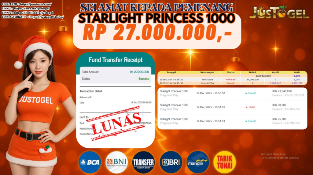 Selamat kepada User ID : DIN***ROAQI Telah berhasil mendapatkan kemenangan besar pada Permainan JP SLOT STARLIGHT PRINCESS 1000 Dengan kemenangan Sebesar Rp 27.000.000,- Setelah mengisi formulir withdraw dengan kurung waktu hanya 5-10 menit pihak JUSTOGEL sudah melakukan transfer kepada pemilik User ID dan dana sudah dapat di cairkan oleh pemenang. Bukti pembayaran yang kami berikan merupakan bukti pembayaran yang SAH / VALID yang langung di dapatkan melaui tanda transfer transaksi dari Bank yang di tuju.
