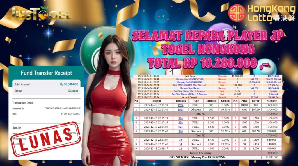 Selamat kepada User ID : YAN***056 Telah berhasil mendapatkan kemenangan besar pada Permainan JP TOGEL HONGKONG LOTTO Dengan kemenangan Sebesar Rp 10.280.000,- Setelah mengisi formulir withdraw dengan kurung waktu hanya 5-10 menit pihak JUSTOGEL sudah melakukan transfer kepada pemilik User ID dan dana sudah dapat di cairkan oleh pemenang. Bukti pembayaran yang kami berikan merupakan bukti pembayaran yang SAH / VALID yang langung di dapatkan melaui tanda transfer transaksi dari Bank yang di tuju.