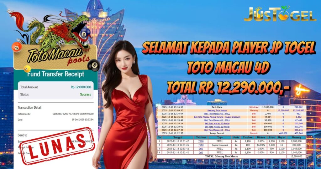 Selamat kepada User ID : DHY***X01Telah berhasil mendapatkan kemenangan besar pada Permainan JP TOGEL TOTO MACAU 4D Dengan kemenangan Sebesar Rp 12.290.000,- Setelah mengisi formulir withdraw dengan kurung waktu hanya 5-10 menit pihak JUSTOGEL sudah melakukan transfer kepada pemilik User ID dan dana sudah dapat di cairkan oleh pemenang. Bukti pembayaran yang kami berikan merupakan bukti pembayaran yang SAH / VALID yang langung di dapatkan melaui tanda transfer transaksi dari Bank yang di tuju.