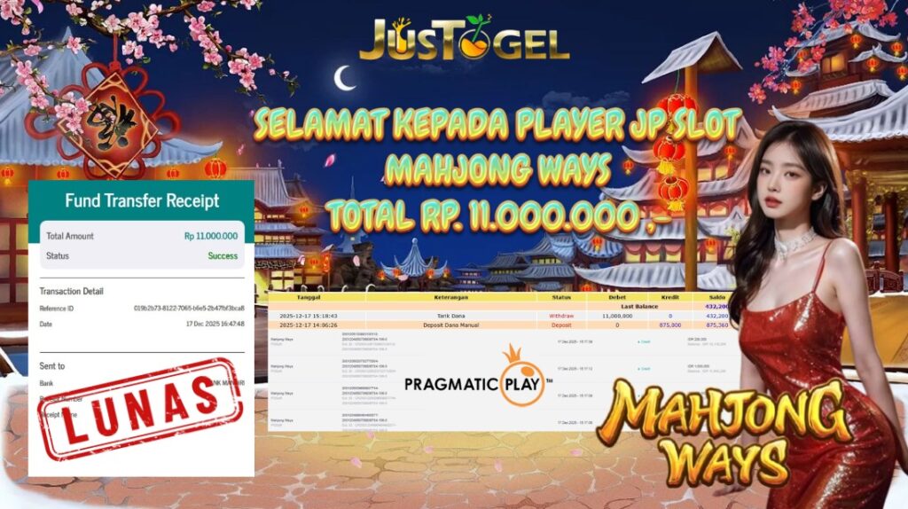 Selamat kepada User ID : ARS***15 Telah berhasil mendapatkan kemenangan besar pada Permainan JP SLOT MAHJONG WAYS Dengan kemenangan Sebesar Rp 11.000.000,- Setelah mengisi formulir withdraw dengan kurung waktu hanya 5-10 menit pihak JUSTOGEL sudah melakukan transfer kepada pemilik User ID dan dana sudah dapat di cairkan oleh pemenang. Bukti pembayaran yang kami berikan merupakan bukti pembayaran yang SAH / VALID yang langung di dapatkan melaui tanda transfer transaksi dari Bank yang di tuju.