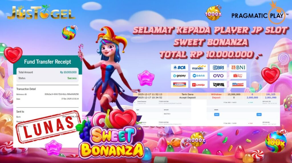 Selamat kepada User ID : ALF***515 Telah berhasil mendapatkan kemenangan besar pada Permainan JP SLOT SWEET BONANZA Dengan kemenangan Sebesar Rp 10.000.000,- Setelah mengisi formulir withdraw dengan kurung waktu hanya 5-10 menit pihak JUSTOGEL sudah melakukan transfer kepada pemilik User ID dan dana sudah dapat di cairkan oleh pemenang. Bukti pembayaran yang kami berikan merupakan bukti pembayaran yang SAH / VALID yang langung di dapatkan melaui tanda transfer transaksi dari Bank yang di tuju.