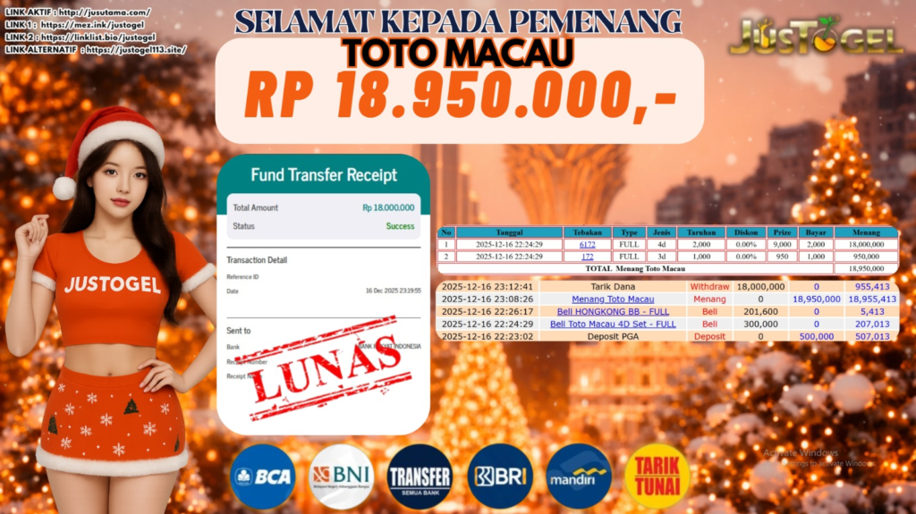 Selamat kepada User ID : MAR***021 Telah berhasil mendapatkan kemenangan besar pada Permainan JP TOGEL TOTO MACAU 4D Dengan kemenangan Sebesar Rp 18.950.000,- Setelah mengisi formulir withdraw dengan kurung waktu hanya 5-10 menit pihak JUSTOGEL sudah melakukan transfer kepada pemilik User ID dan dana sudah dapat di cairkan oleh pemenang. Bukti pembayaran yang kami berikan merupakan bukti pembayaran yang SAH / VALID yang langung di dapatkan melaui tanda transfer transaksi dari Bank yang di tuju.