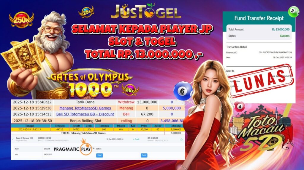 Selamat kepada User ID : RAJ***M80 Telah berhasil mendapatkan kemenangan besar pada Permainan JP SLOT GATES OF OLYMPUS 1000 & TOGEL TOTO MACAO 5D GAMES Dengan kemenangan Sebesar Rp 13.000.000,- Setelah mengisi formulir withdraw dengan kurung waktu hanya 5-10 menit pihak JUSTOGEL sudah melakukan transfer kepada pemilik User ID dan dana sudah dapat di cairkan oleh pemenang. Bukti pembayaran yang kami berikan merupakan bukti pembayaran yang SAH / VALID yang langung di dapatkan melaui tanda transfer transaksi dari Bank yang di tuju.