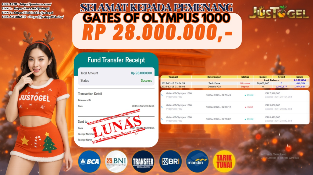 Selamat kepada User ID : HAM***GSA888 Telah berhasil mendapatkan kemenangan besar pada Permainan JP SLOT GATES OF OLYMPUS 1000 Dengan kemenangan Sebesar Rp 28.000.000,- Setelah mengisi formulir withdraw dengan kurung waktu hanya 5-10 menit pihak JUSTOGEL sudah melakukan transfer kepada pemilik User ID dan dana sudah dapat di cairkan oleh pemenang. Bukti pembayaran yang kami berikan merupakan bukti pembayaran yang SAH / VALID yang langung di dapatkan melaui tanda transfer transaksi dari Bank yang di tuju.