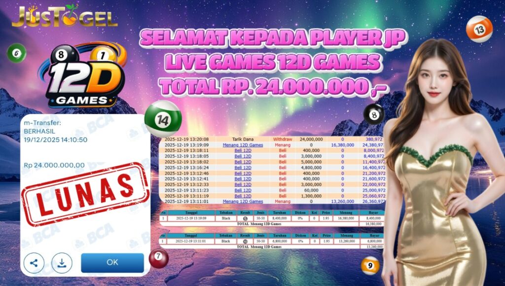 Selamat kepada User ID : BLR***639 Telah berhasil mendapatkan kemenangan besar pada Permainan JP LIVE GAME 12D GAMES Dengan kemenangan Sebesar Rp 24.000.0000,- Setelah mengisi formulir withdraw dengan kurung waktu hanya 5-10 menit pihak JUSTOGEL sudah melakukan transfer kepada pemilik User ID dan dana sudah dapat di cairkan oleh pemenang. Bukti pembayaran yang kami berikan merupakan bukti pembayaran yang SAH / VALID yang langung di dapatkan melaui tanda transfer transaksi dari Bank yang di tuju.