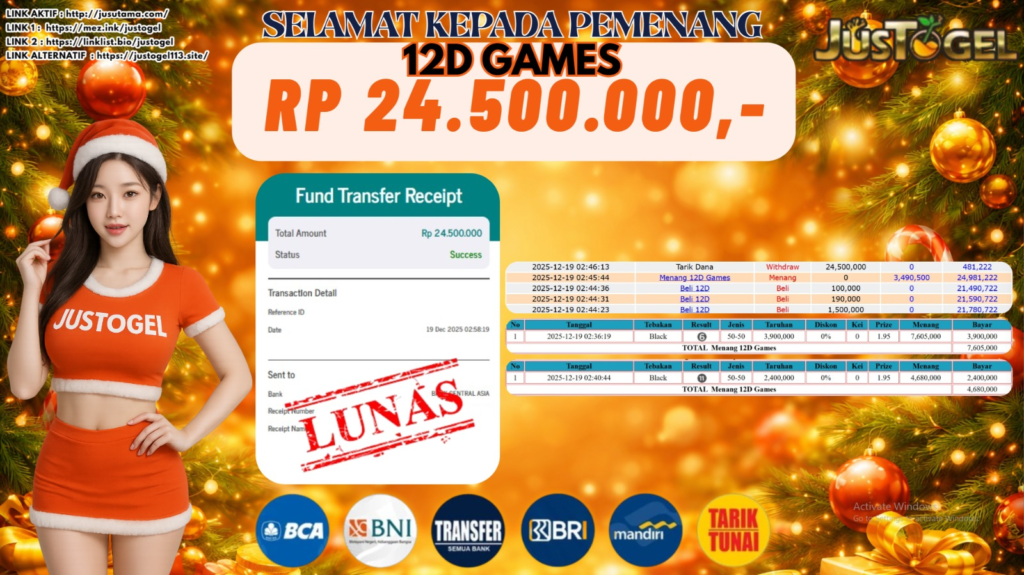 Selamat kepada User ID : YOU***SILEG Telah berhasil mendapatkan kemenangan besar pada Permainan JP LIVE GAME 12D GAMES Dengan kemenangan Sebesar Rp 24.500.000,- Setelah mengisi formulir withdraw dengan kurung waktu hanya 5-10 menit pihak JUSTOGEL sudah melakukan transfer kepada pemilik User ID dan dana sudah dapat di cairkan oleh pemenang. Bukti pembayaran yang kami berikan merupakan bukti pembayaran yang SAH / VALID yang langung di dapatkan melaui tanda transfer transaksi dari Bank yang di tuju.