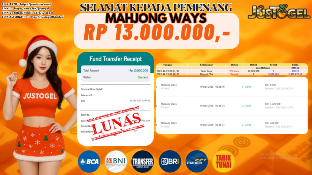 Selamat kepada User ID : MAHK***T451 Telah berhasil mendapatkan kemenangan besar pada Permainan JP SLOT MAHJONG WAYS Dengan kemenangan Sebesar Rp 13.000.000,- Setelah mengisi formulir withdraw dengan kurung waktu hanya 5-10 menit pihak JUSTOGEL sudah melakukan transfer kepada pemilik User ID dan dana sudah dapat di cairkan oleh pemenang. Bukti pembayaran yang kami berikan merupakan bukti pembayaran yang SAH / VALID yang langung di dapatkan melaui tanda transfer transaksi dari Bank yang di tuju.