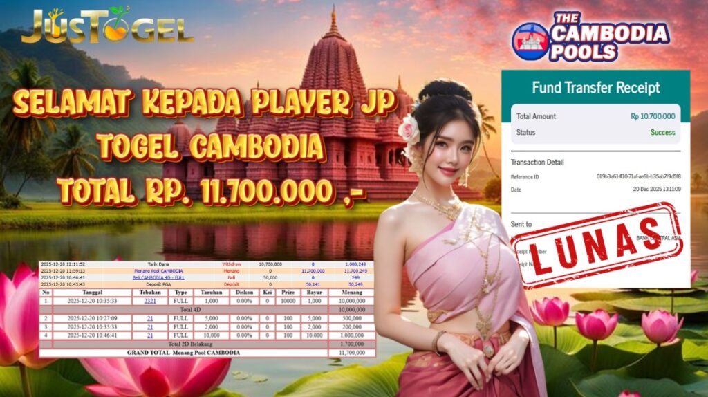 Selamat kepada User ID : JCK***Y88 Telah berhasil mendapatkan kemenangan besar pada Permainan JP TOGEL CAMBODIA Dengan kemenangan Sebesar Rp 11.700.000,- Setelah mengisi formulir withdraw dengan kurung waktu hanya 5-10 menit pihak JUSTOGEL sudah melakukan transfer kepada pemilik User ID dan dana sudah dapat di cairkan oleh pemenang. Bukti pembayaran yang kami berikan merupakan bukti pembayaran yang SAH / VALID yang langung di dapatkan melaui tanda transfer transaksi dari Bank yang di tuju.