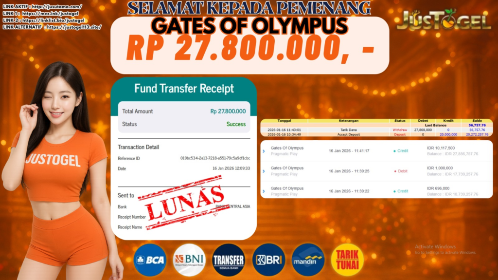 Selamat kepada User ID : MI***DA19 Telah berhasil mendapatkan kemenangan besar pada Permainan JP SLOT GATES OF OLYMPUS Dengan kemenangan Sebesar Rp. 27.800.000,- Setelah mengisi formulir withdraw dengan kurung waktu hanya 5-10 menit pihak JUSTOGEL sudah melakukan transfer kepada pemilik User ID dan dana sudah dapat di cairkan oleh pemenang. Bukti pembayaran yang kami berikan merupakan bukti pembayaran yang SAH / VALID yang langung di dapatkan melaui tanda transfer transaksi dari Bank yang di tuju.