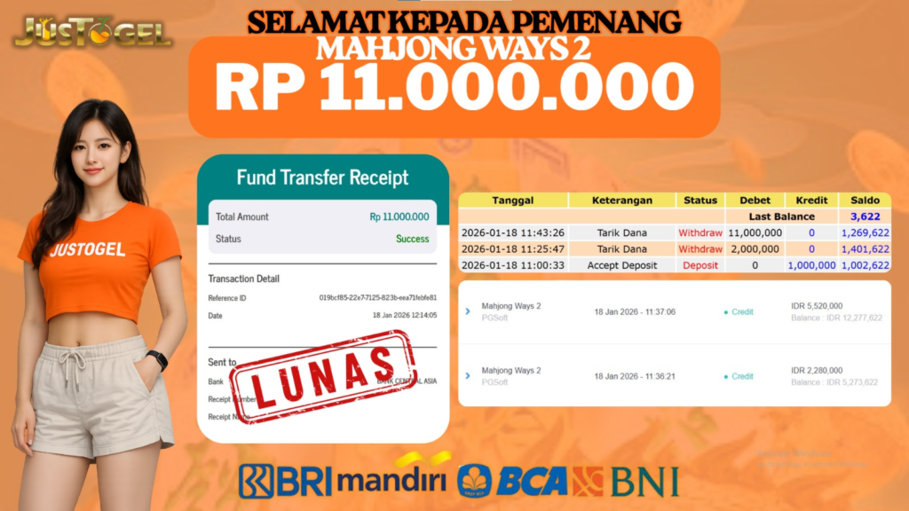 Selamat kepada User ID : SRE***EYY Telah berhasil mendapatkan kemenangan besar pada Permainan JP SLOT MAHJONG WAYS 2 Dengan kemenangan Sebesar Rp. 11.000.000,- Setelah mengisi formulir withdraw dengan kurung waktu hanya 5-10 menit pihak JUSTOGEL sudah melakukan transfer kepada pemilik User ID dan dana sudah dapat di cairkan oleh pemenang. Bukti pembayaran yang kami berikan merupakan bukti pembayaran yang SAH / VALID yang langung di dapatkan melaui tanda transfer transaksi dari Bank yang di tuju.