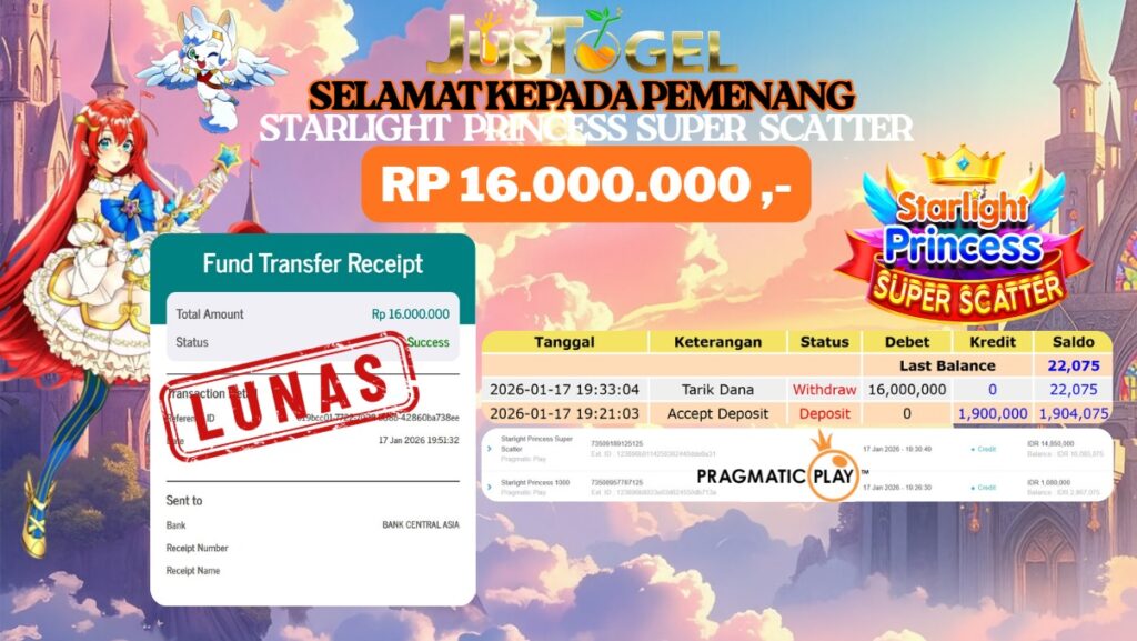 Selamat kepada User ID : DOY***KXX123 Telah berhasil mendapatkan kemenangan besar pada Permainan JP SLOT STARLIGHT PRINCESS SUPER SCATTER Dengan kemenangan Sebesar Rp. 16.000.000,- Setelah mengisi formulir withdraw dengan kurung waktu hanya 5-10 menit pihak JUSTOGEL sudah melakukan transfer kepada pemilik User ID dan dana sudah dapat di cairkan oleh pemenang. Bukti pembayaran yang kami berikan merupakan bukti pembayaran yang SAH / VALID yang langung di dapatkan melaui tanda transfer transaksi dari Bank yang di tuju.