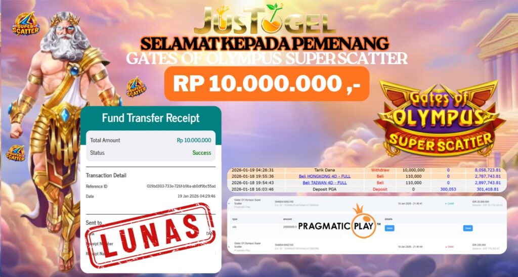 Selamat kepada User ID : GRA***EEEE3 Telah berhasil mendapatkan kemenangan besar pada Permainan JP SLOT GATES OF OLYMPUS SUPER SCATTER Dengan kemenangan Sebesar Rp. 10.000.000,- Setelah mengisi formulir withdraw dengan kurung waktu hanya 5-10 menit pihak JUSTOGEL sudah melakukan transfer kepada pemilik User ID dan dana sudah dapat di cairkan oleh pemenang. Bukti pembayaran yang kami berikan merupakan bukti pembayaran yang SAH / VALID yang langung di dapatkan melaui tanda transfer transaksi dari Bank yang di tuju.