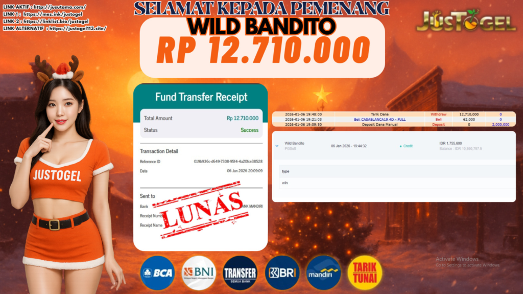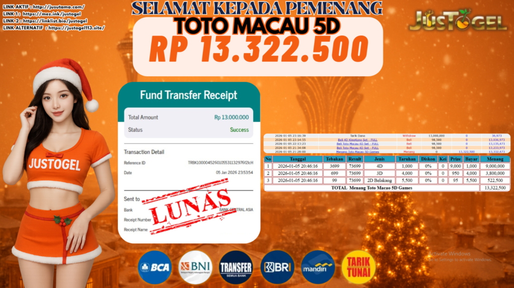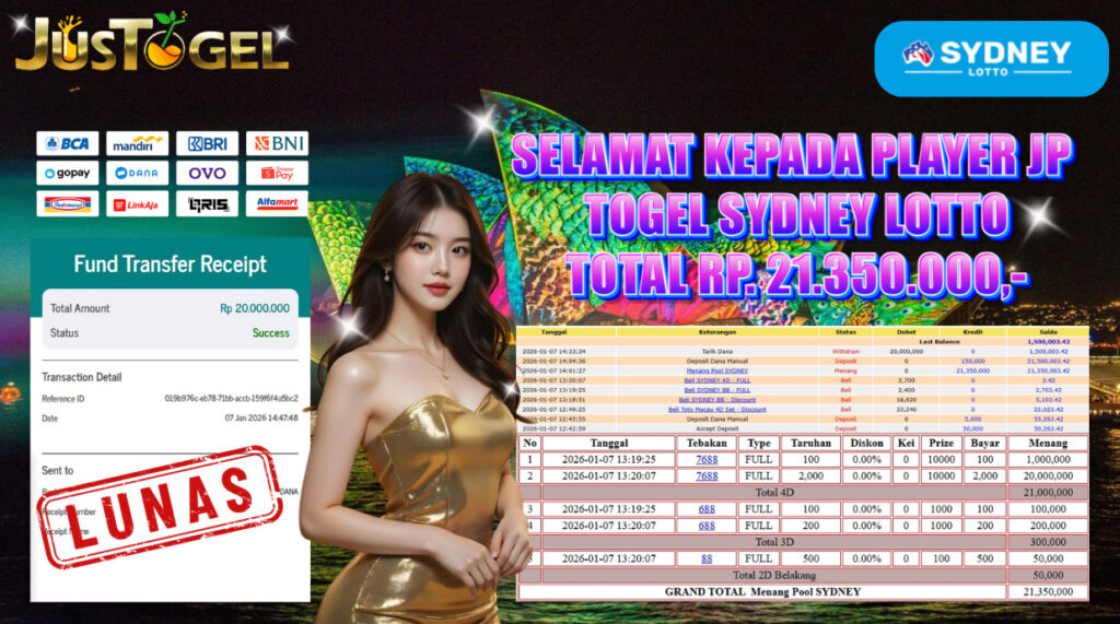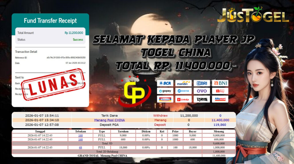 Selamat kepada User ID : GAL***TH55 Telah berhasil mendapatkan kemenangan besar pada Permainan JP TOGEL CAMBODIA Dengan kemenangan Sebesar 12.500.000,- Setelah mengisi formulir withdraw dengan kurung waktu hanya 5-10 menit pihak JUSTOGEL sudah melakukan transfer kepada pemilik User ID dan dana sudah dapat di cairkan oleh pemenang. Bukti pembayaran yang kami berikan merupakan bukti pembayaran yang SAH / VALID yang langung di dapatkan melaui tanda transfer transaksi dari Bank yang di tuju.