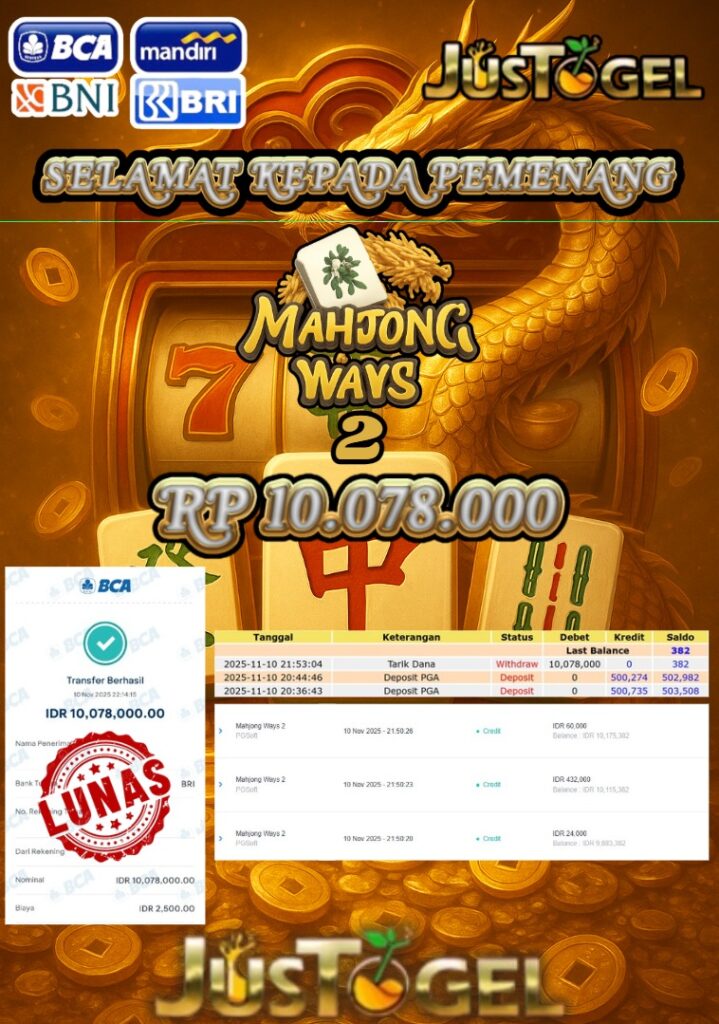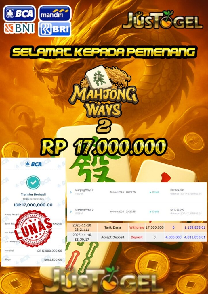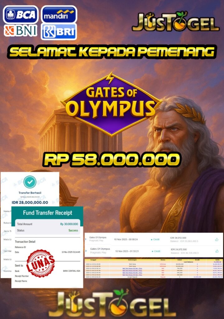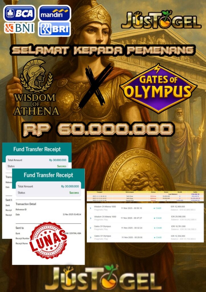 Selamat kepada User ID : FER***DO55 Telah berhasil mendapatkan kemenangan besar pada Permainan JP SLOT WISDOM OF ATHENA 1000 & GATES OF OLYMPUS Dengan kemenangan Sebesar Rp 60.000.000,- Setelah mengisi formulir withdraw dengan kurung waktu hanya 5-10 menit pihak JUSTOGEL sudah melakukan transfer kepada pemilik User ID dan dana sudah dapat di cairkan oleh pemenang. Bukti pembayaran yang kami berikan merupakan bukti pembayaran yang SAH / VALID yang langung di dapatkan melaui tanda transfer transaksi dari Bank yang di tuju.