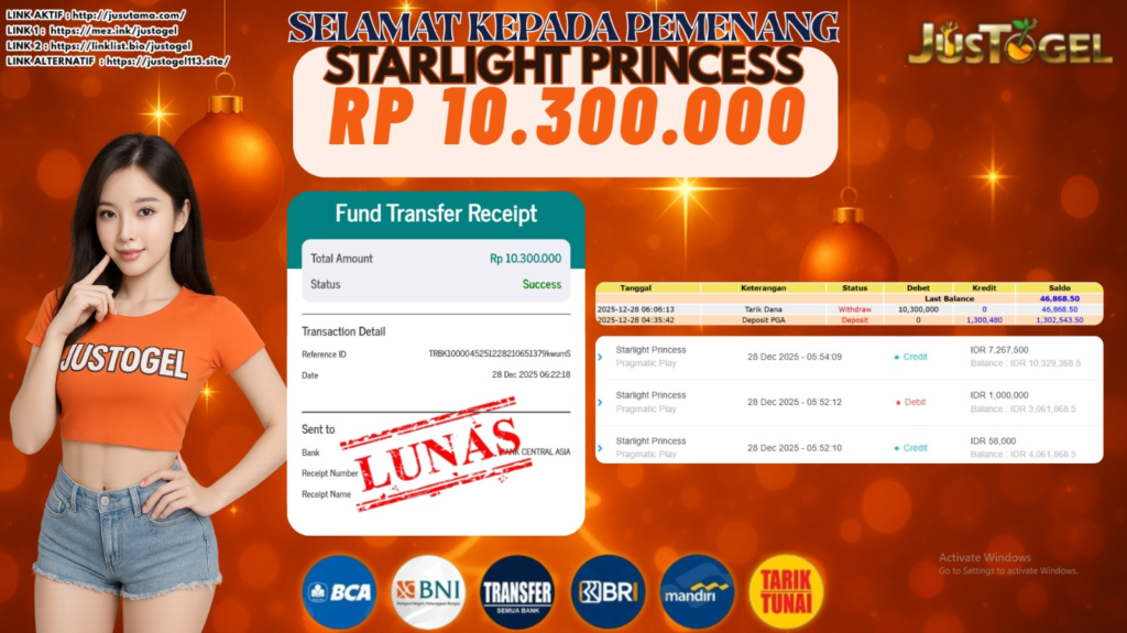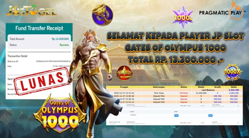 Selamat kepada User ID : YIS***M33 Telah berhasil mendapatkan kemenangan besar pada Permainan JP SLOT GATES OF OLYMPUS Dengan kemenangan Sebesar Rp 10.400.000,- Setelah mengisi formulir withdraw dengan kurung waktu hanya 5-10 menit pihak JUSTOGEL sudah melakukan transfer kepada pemilik User ID dan dana sudah dapat di cairkan oleh pemenang. Bukti pembayaran yang kami berikan merupakan bukti pembayaran yang SAH / VALID yang langung di dapatkan melaui tanda transfer transaksi dari Bank yang di tuju.