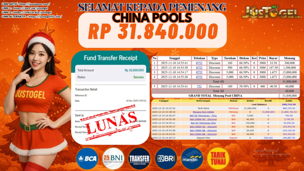 Selamat kepada User ID : TAK***KIMBA Telah berhasil mendapatkan kemenangan besar pada Permainan JP TOGEL CHINA POOLS Dengan kemenangan Sebesar Rp 31.840.000,- Setelah mengisi formulir withdraw dengan kurung waktu hanya 5-10 menit pihak JUSTOGEL sudah melakukan transfer kepada pemilik User ID dan dana sudah dapat di cairkan oleh pemenang. Bukti pembayaran yang kami berikan merupakan bukti pembayaran yang SAH / VALID yang langung di dapatkan melaui tanda transfer transaksi dari Bank yang di tuju.