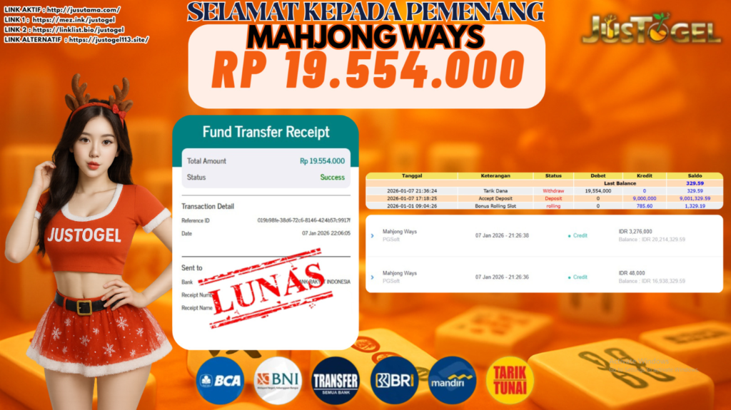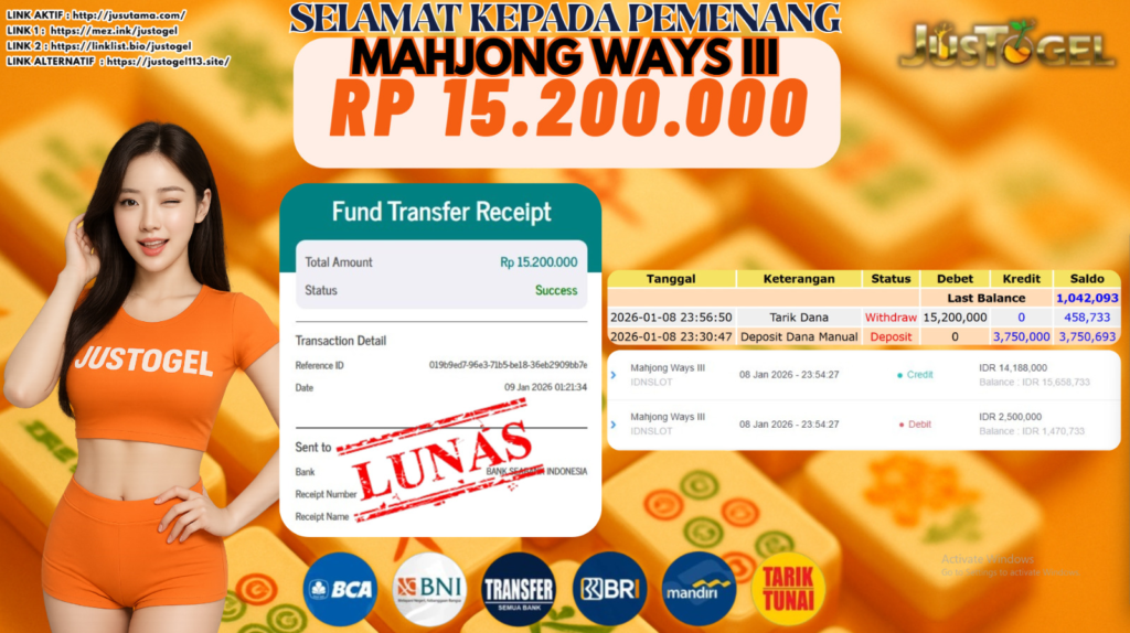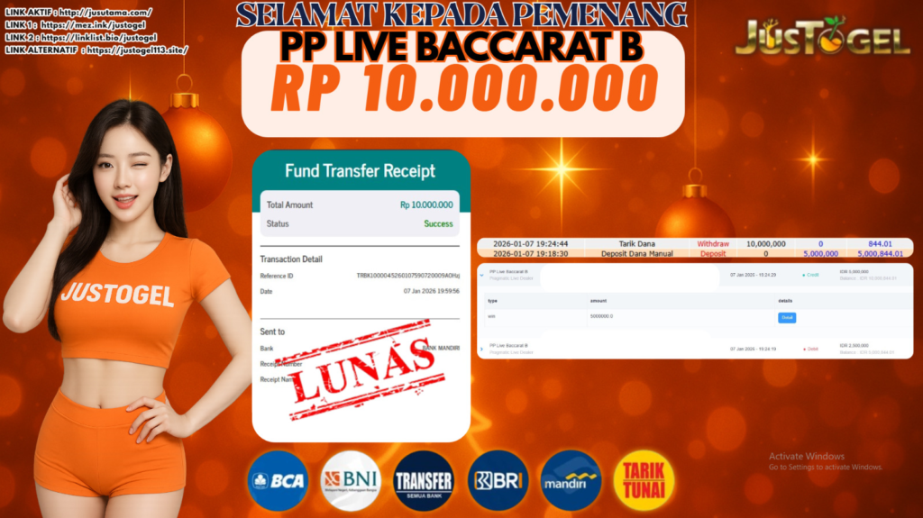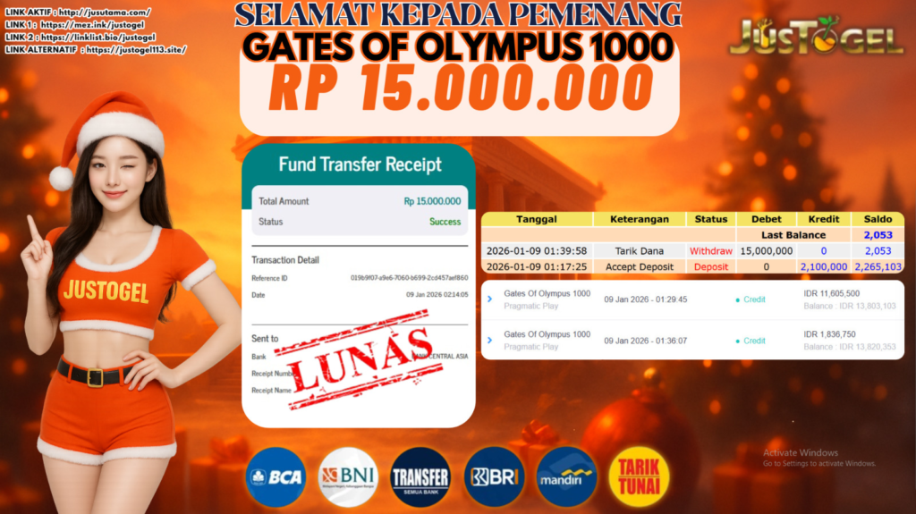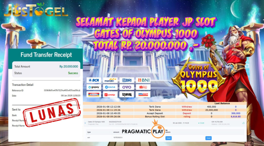 Selamat kepada User ID : TIN***DRL Telah berhasil mendapatkan kemenangan besar pada Permainan JP SLOT GATES OF OLYMPUS SUPER SCATTER Dengan kemenangan Sebesar Rp. 37.000.000 ,- Setelah mengisi formulir withdraw dengan kurung waktu hanya 5-10 menit pihak JUSTOGEL sudah melakukan transfer kepada pemilik User ID dan dana sudah dapat di cairkan oleh pemenang. Bukti pembayaran yang kami berikan merupakan bukti pembayaran yang SAH / VALID yang langung di dapatkan melaui tanda transfer transaksi dari Bank yang di tuju.