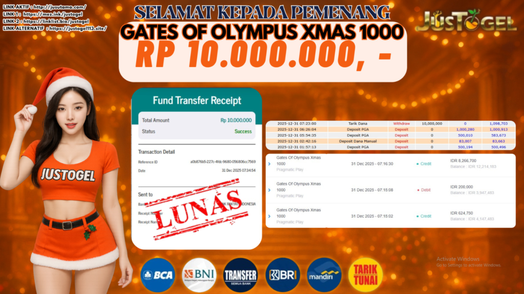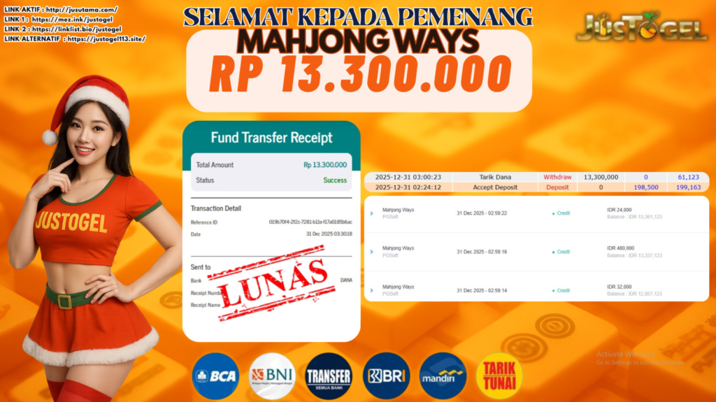 Selamat kepada User ID : LAM***RTI22 Telah berhasil mendapatkan kemenangan besar pada Permainan JP SLOT MAHJONG WAYS Dengan kemenangan Sebesar Rp 10.000.000,- Setelah mengisi formulir withdraw dengan kurung waktu hanya 5-10 menit pihak JUSTOGEL sudah melakukan transfer kepada pemilik User ID dan dana sudah dapat di cairkan oleh pemenang. Bukti pembayaran yang kami berikan merupakan bukti pembayaran yang SAH / VALID yang langung di dapatkan melaui tanda transfer transaksi dari Bank yang di tuju.