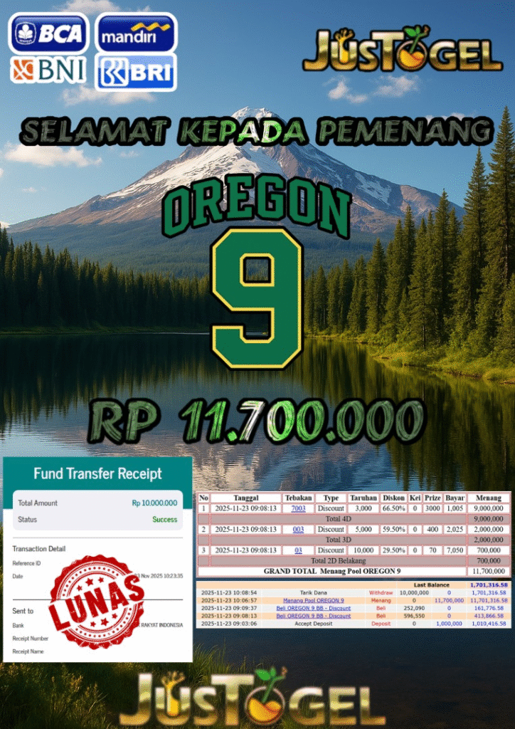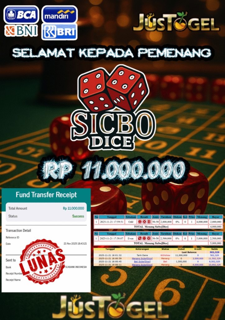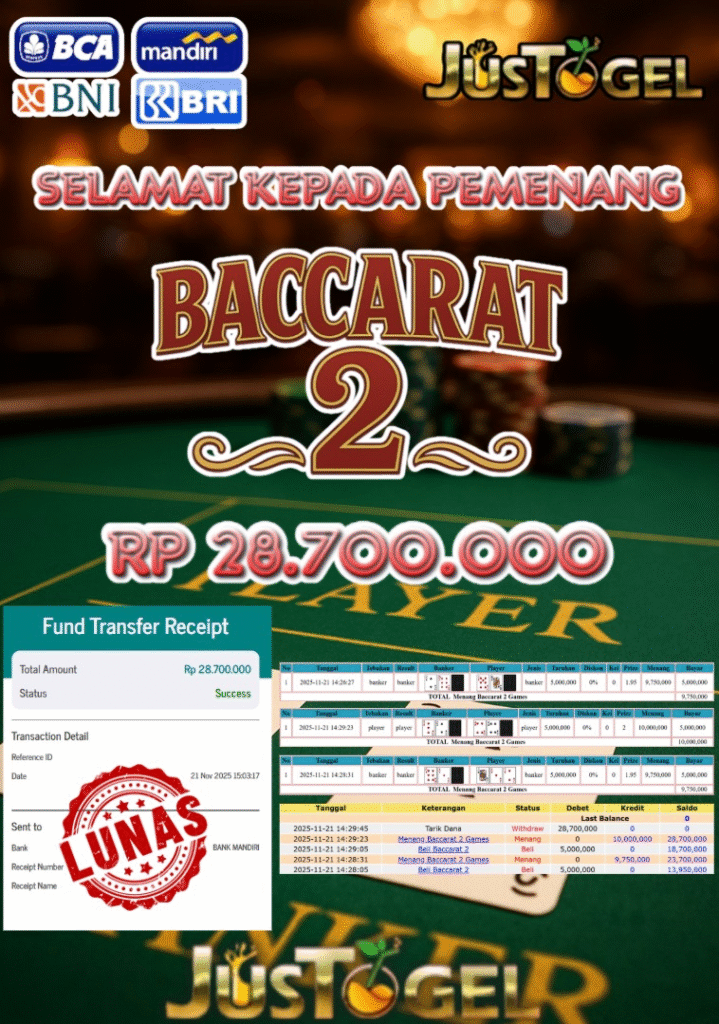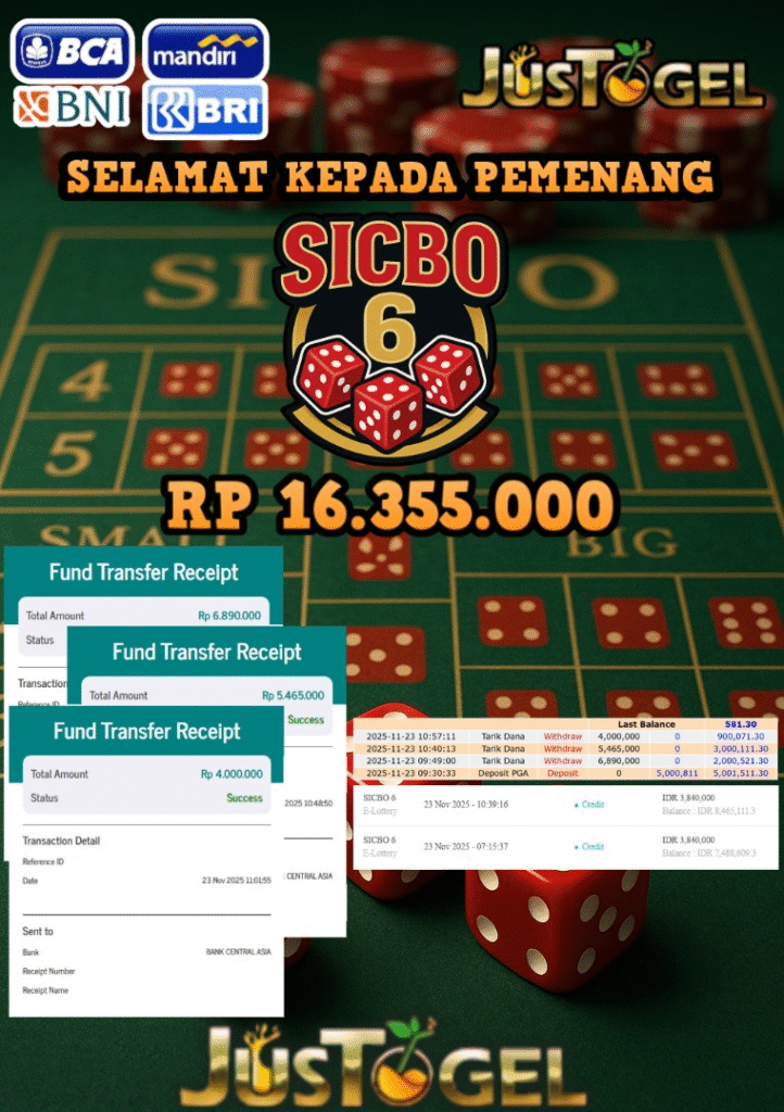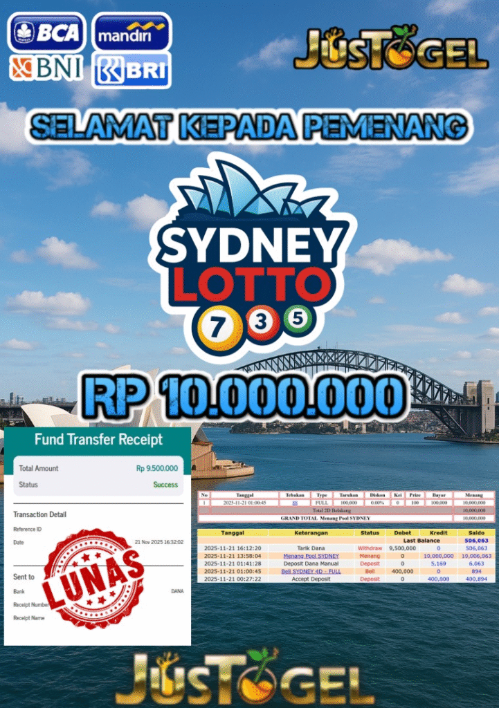 Selamat kepada User ID : HAM***AN Telah berhasil mendapatkan kemenangan besar pada Permainan JP TOGEL TOTO MACAU 5D Dengan kemenangan Sebesar Rp 11.400.000,- Setelah mengisi formulir withdraw dengan kurung waktu hanya 5-10 menit pihak JUSTOGEL sudah melakukan transfer kepada pemilik User ID dan dana sudah dapat di cairkan oleh pemenang. Bukti pembayaran yang kami berikan merupakan bukti pembayaran yang SAH / VALID yang langung di dapatkan melaui tanda transfer transaksi dari Bank yang di tuju.