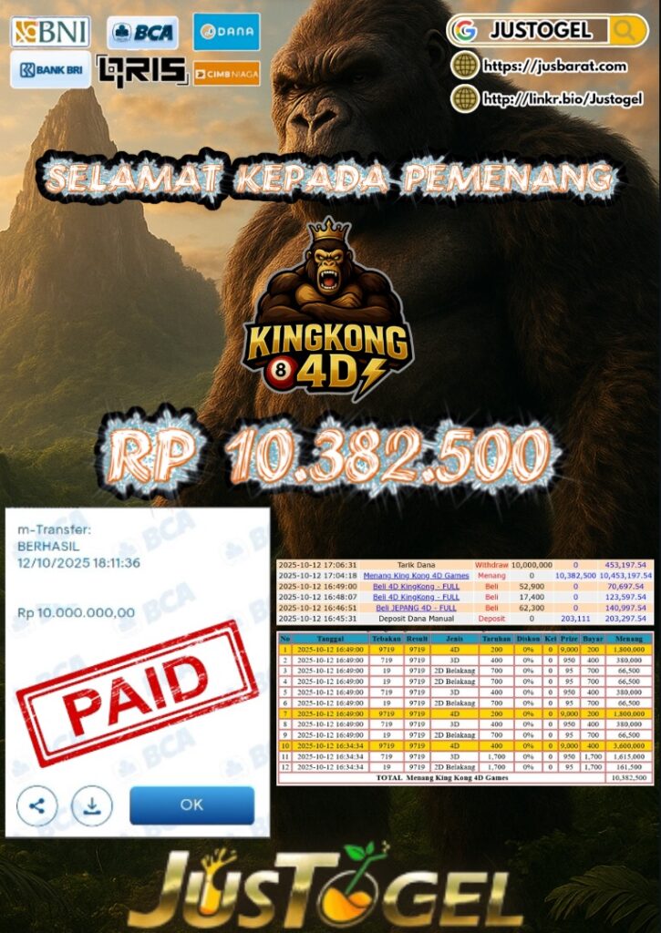Selamat kepada User ID : AS***LHAM Telah berhasil mendapatkan kemenangan besar pada Permainan JP TOGEL KINGKONG 4D Dengan kemenangan Sebesar Rp 10.382.500,- Setelah mengisi formulir withdraw dengan kurung waktu hanya 5-10 menit pihak JUSTOGEL sudah melakukan transfer kepada pemilik User ID dan dana sudah dapat di cairkan oleh pemenang. Bukti pembayaran yang kami berikan merupakan bukti pembayaran yang SAH / VALID yang langung di dapatkan melaui tanda transfer transaksi dari Bank yang di tuju.