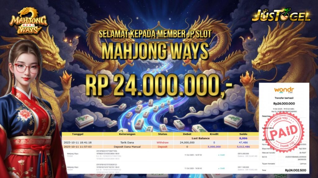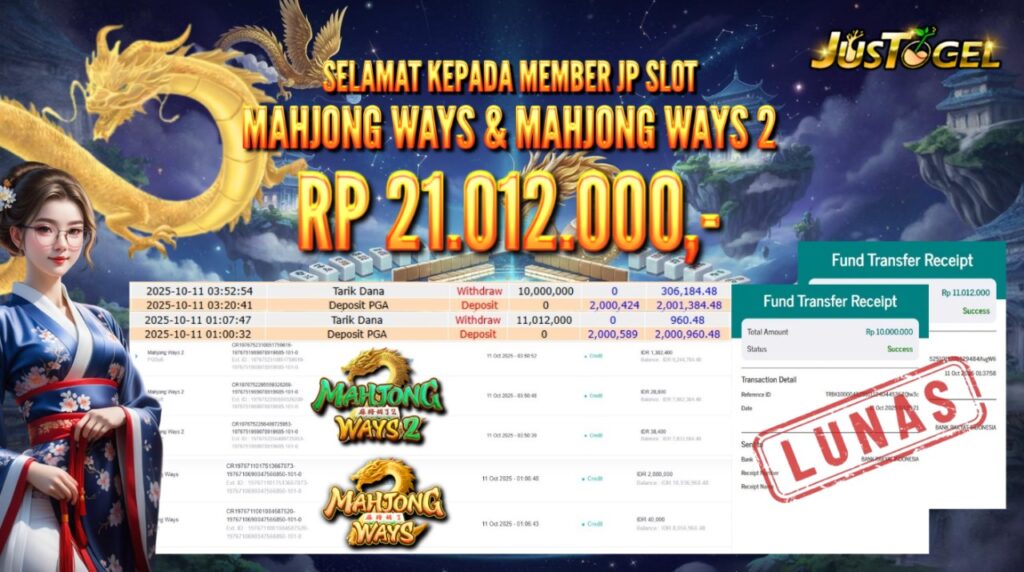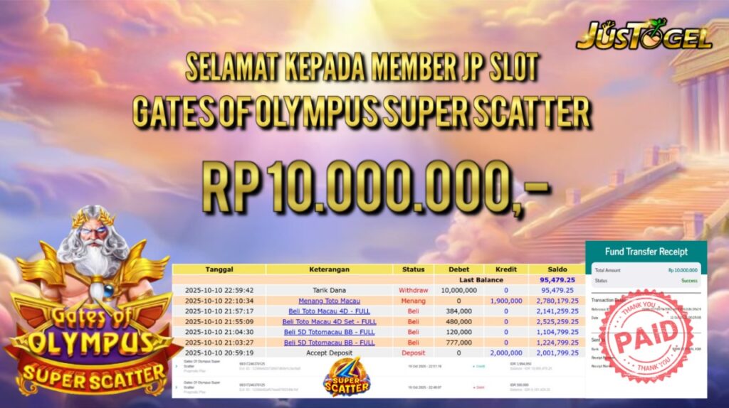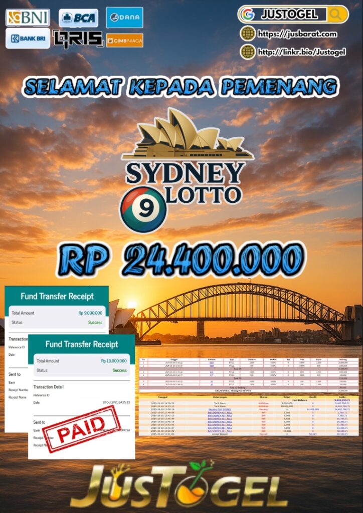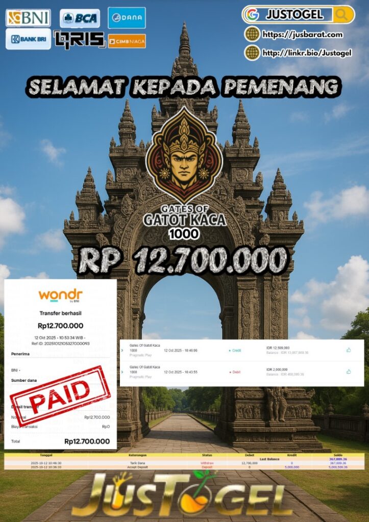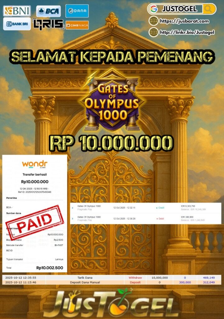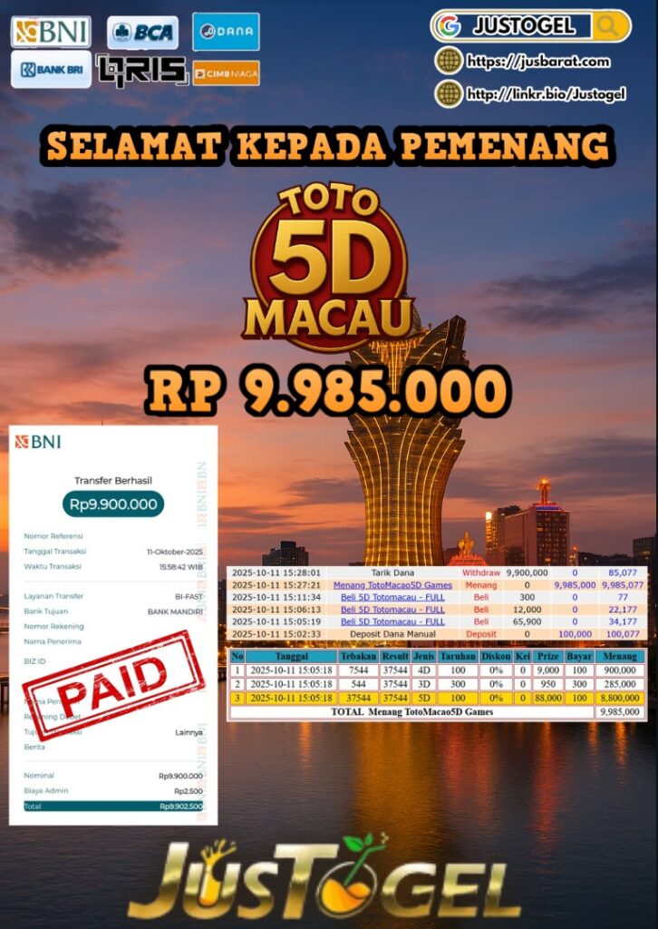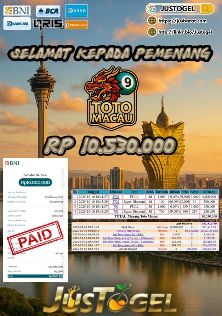 Selamat kepada User ID : AS***LHAM Telah berhasil mendapatkan kemenangan besar pada Permainan JP TOGEL KINGKONG 4D Dengan kemenangan Sebesar Rp 10.382.500,- Setelah mengisi formulir withdraw dengan kurung waktu hanya 5-10 menit pihak JUSTOGEL sudah melakukan transfer kepada pemilik User ID dan dana sudah dapat di cairkan oleh pemenang. Bukti pembayaran yang kami berikan merupakan bukti pembayaran yang SAH / VALID yang langung di dapatkan melaui tanda transfer transaksi dari Bank yang di tuju.