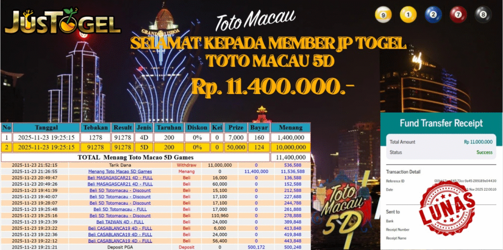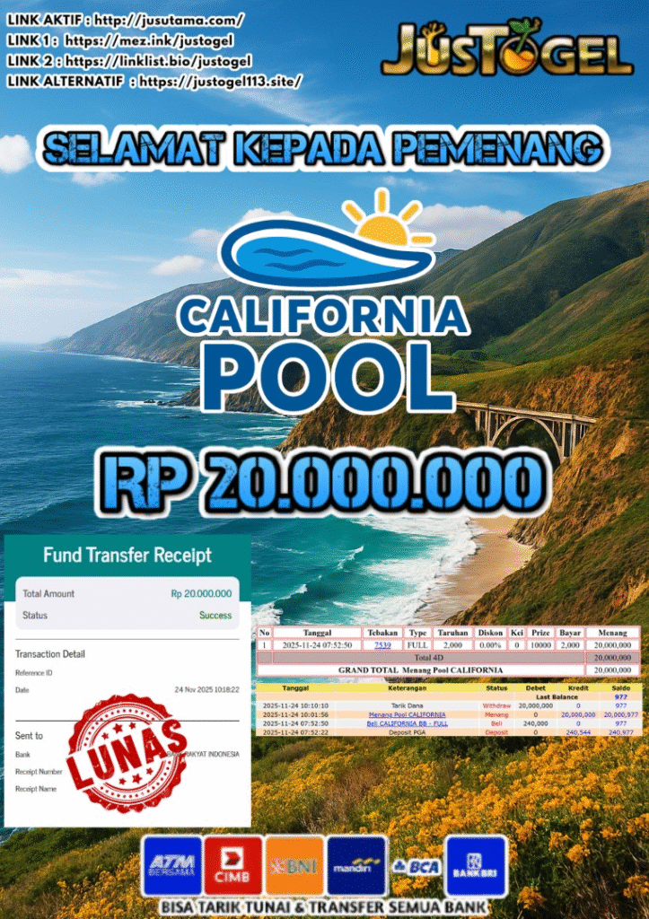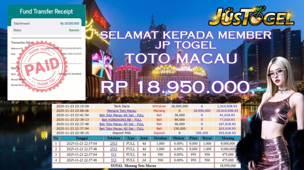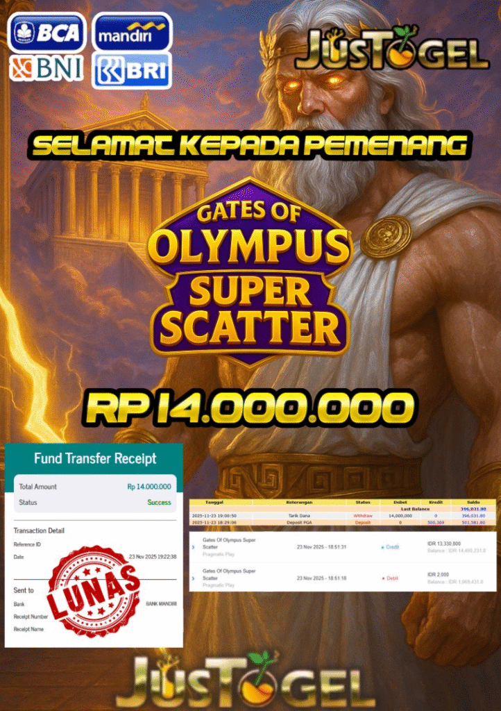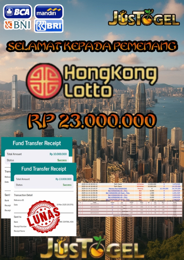Selamat kepada User ID : MAS***TTI23 Telah berhasil mendapatkan kemenangan besar pada Permainan JP TOGEL HONGKONG LOTTO Dengan kemenangan Sebesar Rp 15.500.000,- Setelah mengisi formulir withdraw dengan kurung waktu hanya 5-10 menit pihak JUSTOGEL sudah melakukan transfer kepada pemilik User ID dan dana sudah dapat di cairkan oleh pemenang. Bukti pembayaran yang kami berikan merupakan bukti pembayaran yang SAH / VALID yang langung di dapatkan melaui tanda transfer transaksi dari Bank yang di tuju.
